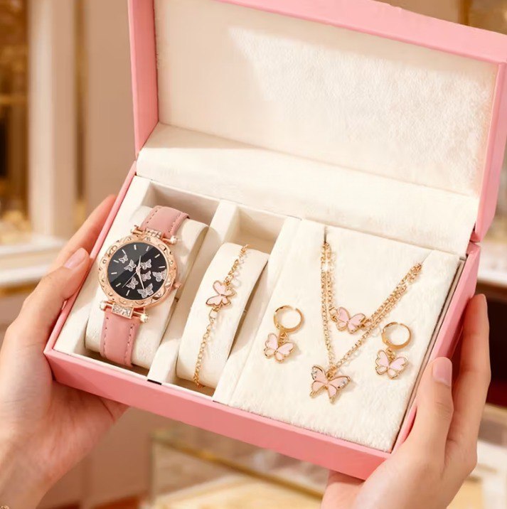 Our sets are designed for those who love harmonious looks every day. In the set you will find a round watch on a thin PU leather strap, four elegant jewelry and a bracelet with small shining butterflies that gently emphasize the movement of the wrist. Each detail is made of a light alloy with a delicate shine, which makes the set universal for any season. The watch works on a quartz mechanism and is powered by a compact coin battery - reliably and simply. The butterflies on the bracelet and pendants add lightness and a feeling of spring to the image even in the cold season. The sets come in an elegant box, ready to become a nice gift. Wear everything together or combine them separately - the sets easily adapt to your mood. We give you the opportunity to look stylish and feel special every minute.